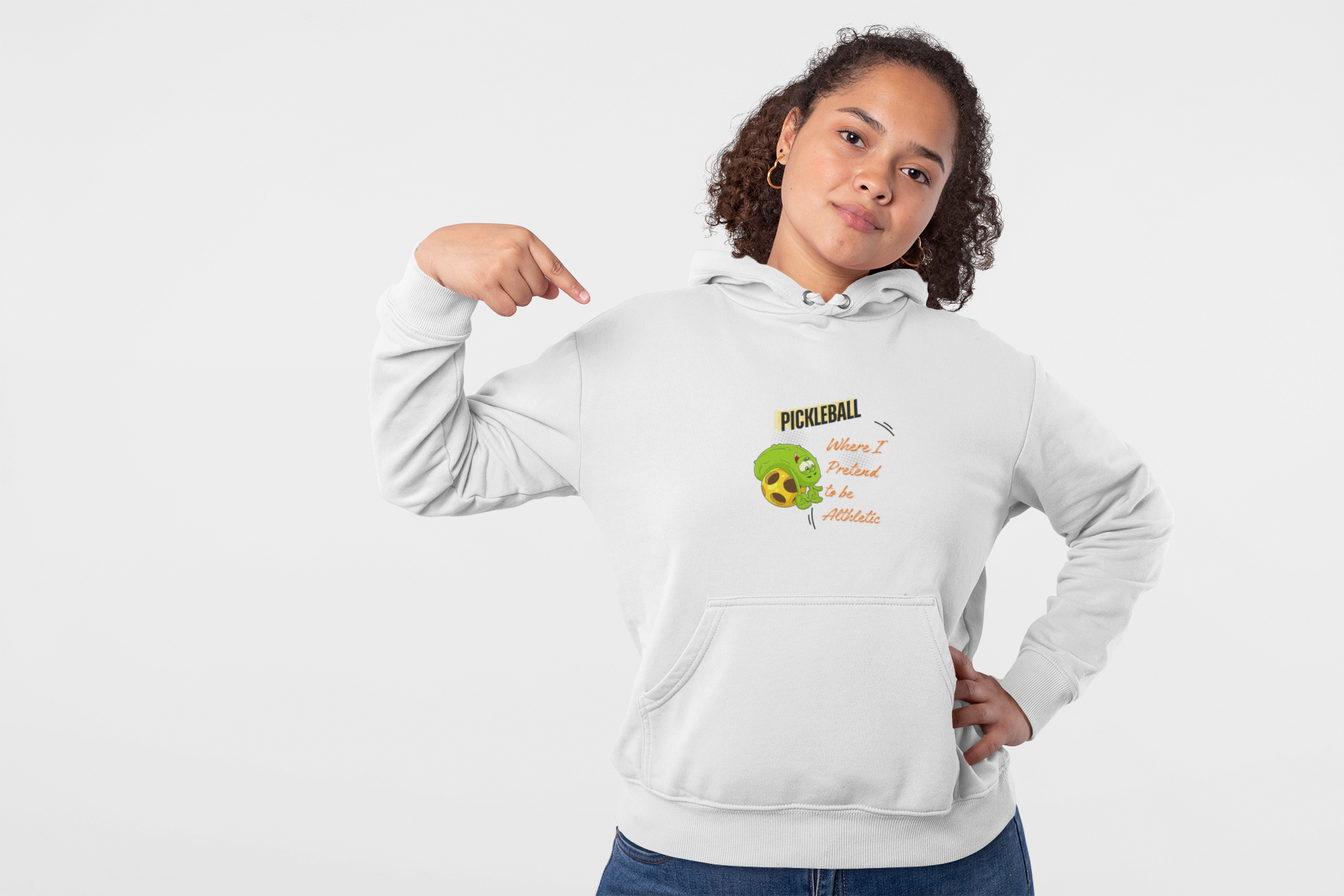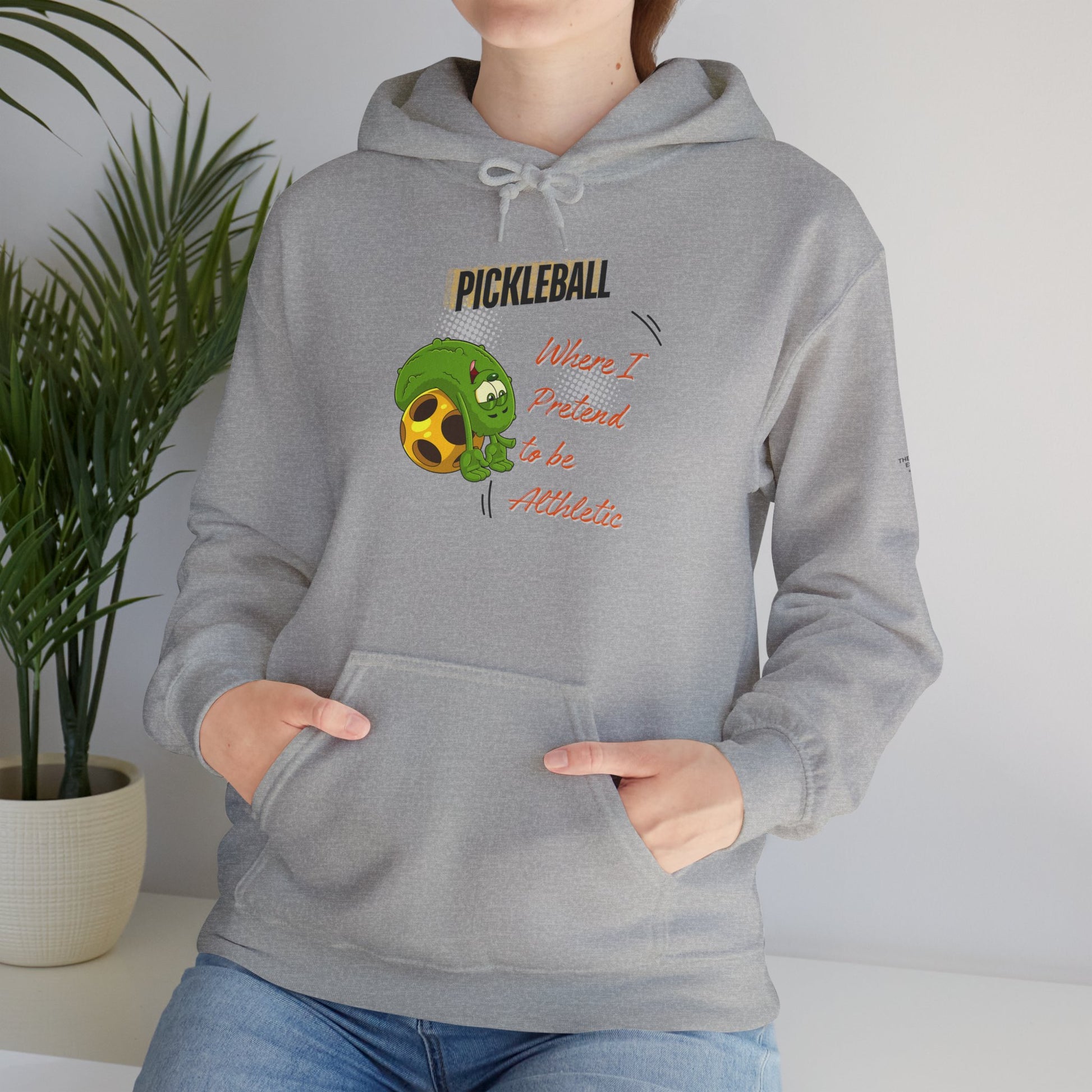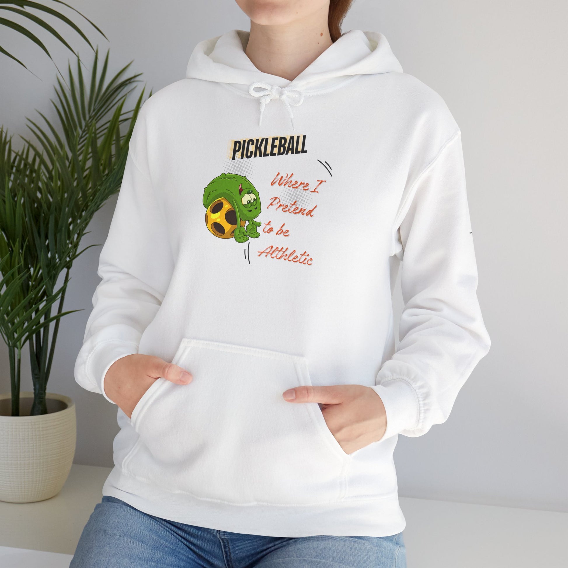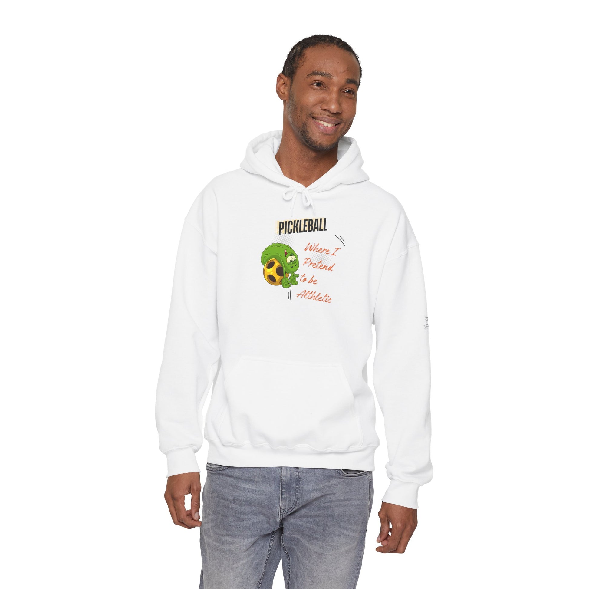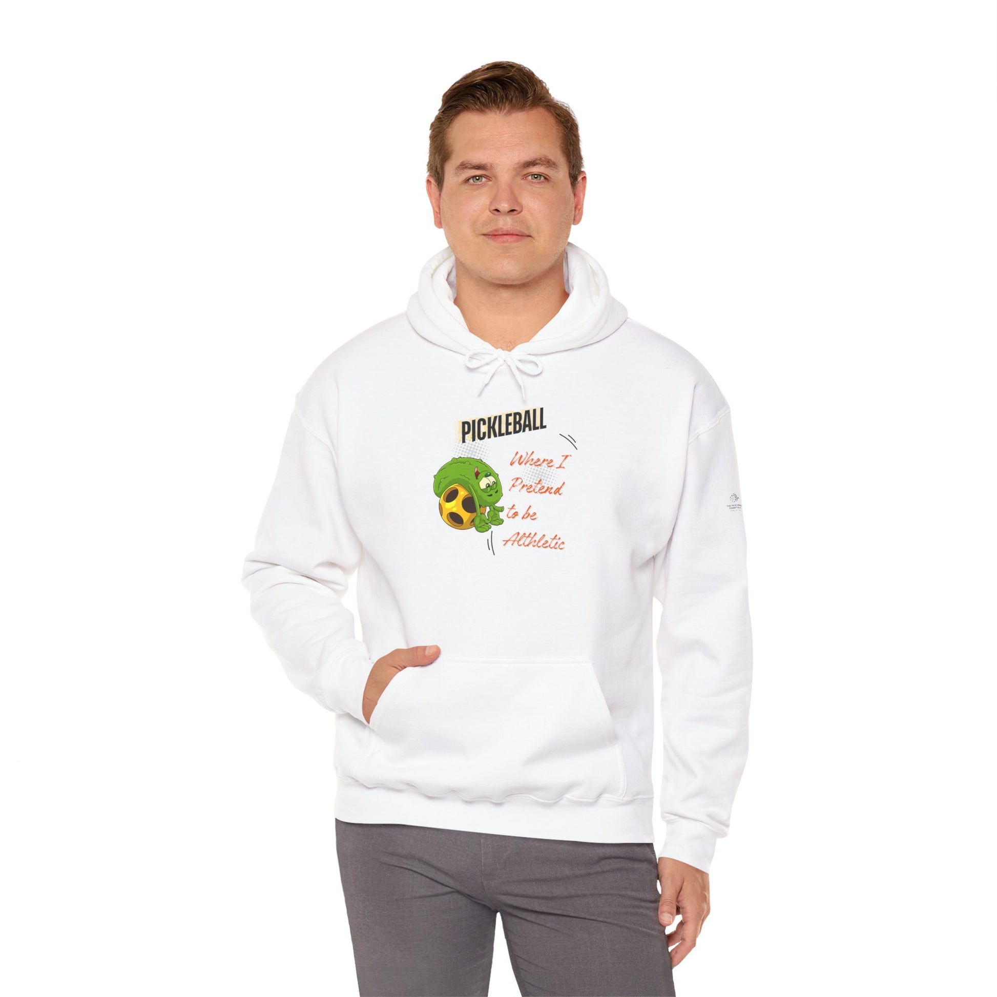 The “Pickleball Where I Pretend To Be Athletic” casual hooded sweatshirt is a Pickleballer's dream come true. This funny and The soft, medium-weight fabric holds its shape while keeping you warm on cool mornings. The roomy kangaroo pocket and adjustable drawstring hood feel familiar and comforting after a long match. Wear the funny pickleball hooded sweatshit to unleash your inner pickleball fanatic.